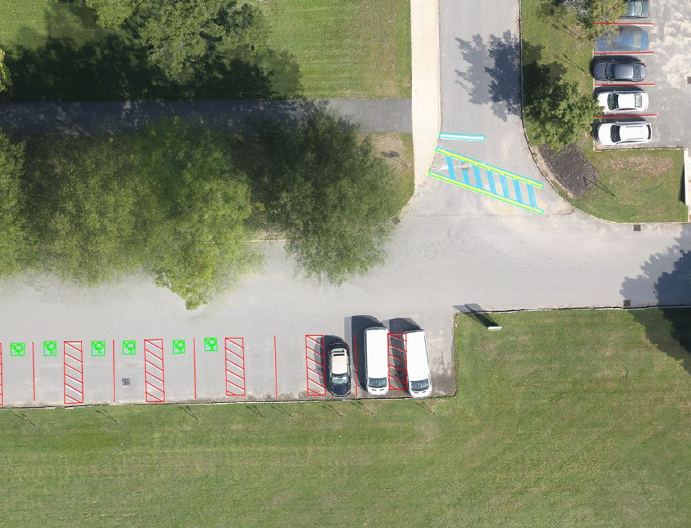 How it’s drafted? | This layer is delivered in three different possible formats; single polyline labeled at the centerline of thin pavement markings, closed polyline labeled at the outside edge of thick pavement markings, closed polyline labeled at the outside edge of pavement marking symbols and lettering. We interpolate through obstructions over a short distance (i.e. under cars). |