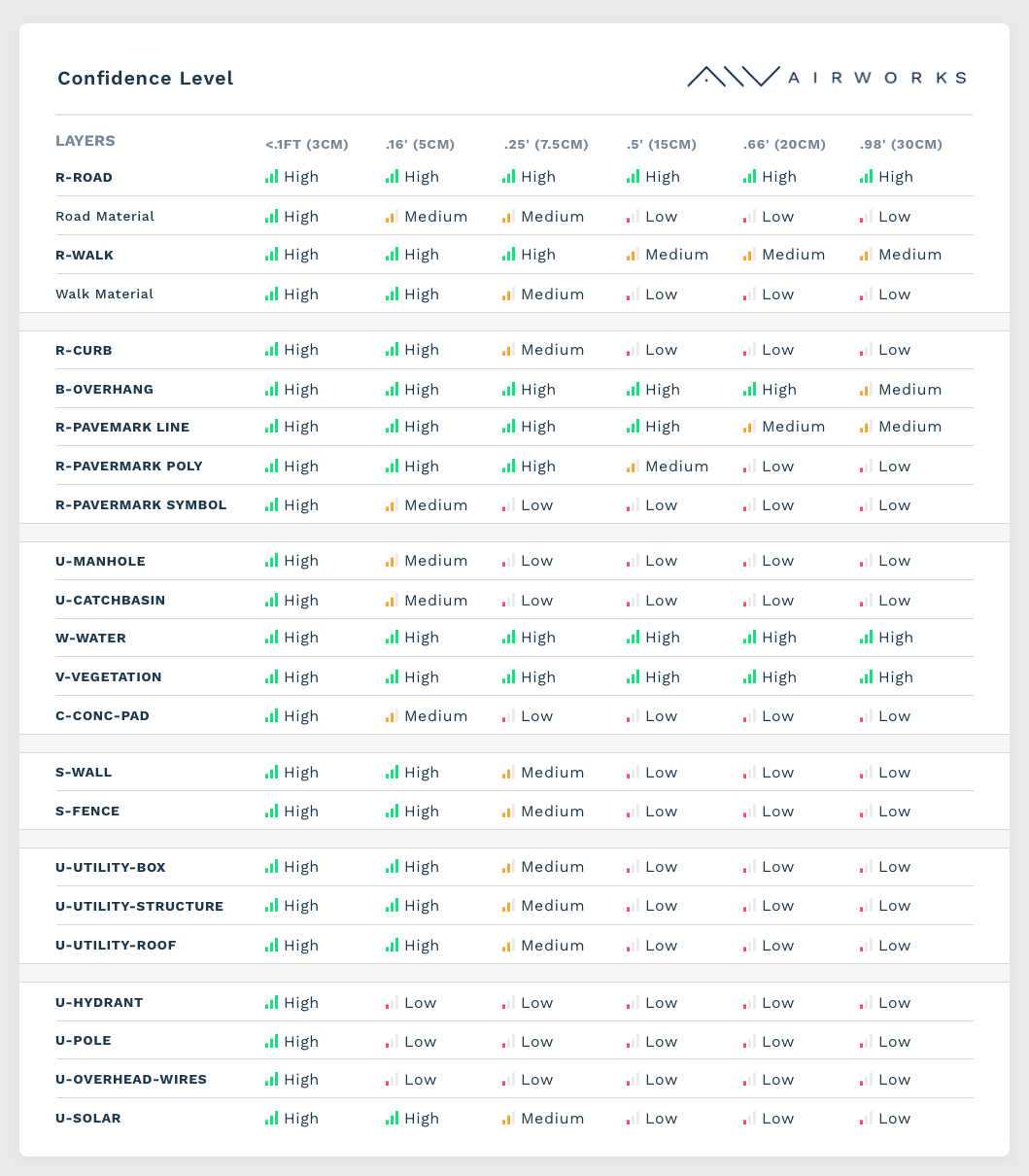 We at AirWorks strive to provide the most accurate output for your layers using our state of the art algorithms and our in-house team of CAD engineers. In order to ensure your team receives output .dxfs of the highest quality, we want to share our confidence level in our output for each layer given the input data’s Ground Sampling Distance. You should use this document as a guide post for the level of confidence we have in our output per layer at different ground sampling distances.